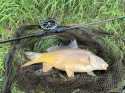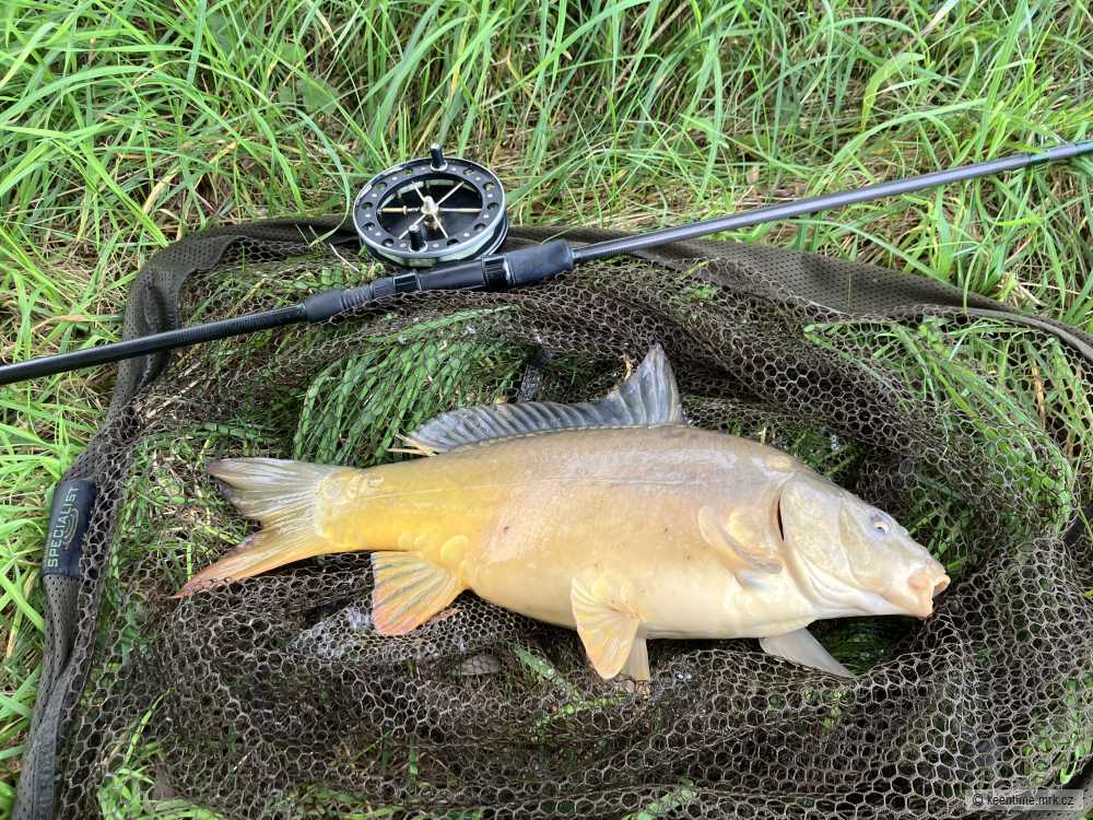Budíček v pět, po cestě k řece ještě prozíravě prohodím peletkama na pískovně jeden flek, kde jsem minule pozoroval nějakou aktivitu. No a pak zase s pečivem pod stromy, ale Alz je po deštích trochu nahoře... přede mnou se voda točí a vře, na vlasci mi furt visí nějaké traviny... asi po hodině nacházím mezi všemi těmi protiproudy klidnější flek a vydoluju odtud jednoho menšího tloušťáka. Po chvilce to balím a akce kapr k obědu se rozjíždí naplno. Na pískovně tentokrát sám, skončily konečně prázdniny, tak jsou zřejmě všichni ve škole nebo v práci. Nához sedí... dva loky pivka a následuje krátká jízda... škoda, asi se vyháknul nebo jen přejezd... pomalu namotávám a sleduju s údivem, že vlasec víc a víc směřuje pod keř po pravé ruce... zkusím trochu zabrat... světe div se, je furt tam. Chvilku se, násaďáček, snaží pak u hladiny něco vymyslet, ale tady už je konec. Rychlá fotka nahoře v trávě, následuje pozvání na prohlídku kuchyně... tenhle rok odnesená třetí rybka.Tož tak.