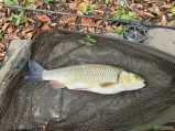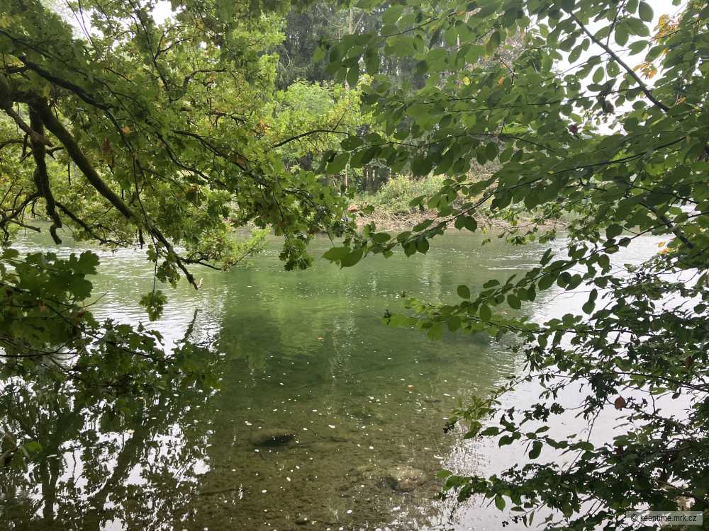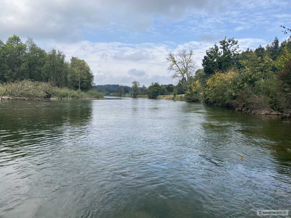 Hned na prvním místě pod stromy jednoho zahlédnu, první nához moc doprava, po dvou třech minutách to stáhnu a nahazuji znovu víc pod větve... 10-15 sekund a je tam. Krásná ryba, do padesátky chybí milimetry. Stojím dlouho, snad se ještě něco povede a pak hledám v blízkosti nalevo i napravo, ale kromě jedné velké štiky, která se před mým pohledem stáhla do hloubky, nevidět nic. Ač by se to mohlo zdát podivné, jsem tu kvůli línům... tady pod větvemi se jich několik zdržuje... jeden z nich je mohutná statná ryba odhadem přes padesát centimetrů. Ale nevidět ani droboť, natož velké ryby. Procházím tichým lesem až daleko k ohbí, kde řeka nabírá hodně do šířky. Zelené podlouhlé řasy tady pokryly dno, kam až dohlédnu, jen málokde zůstal ušetřený malý ostrůvek oblázků a štěrku mezi těmi podvodními lukami. Hloubku odhaduju maximálně do jednoho metru. Stojím tam pod starými duby a oko hledá... je třeba trpělivost... většinou je prozradí záblesk těla... nebo rychlejěí pohyb... asi dvacet metrů přímo přede mnou šedé tělo... tloušť nebo parma? Těžko říct, ale je to jedno. Sleduju, jak pomalu klouže v proudu... stále kamsi proti... velká řeka lemovaná na obou stranách hlubokým lesem a jen tahle jedna divoká ryba na své pouti... dík Péťo.